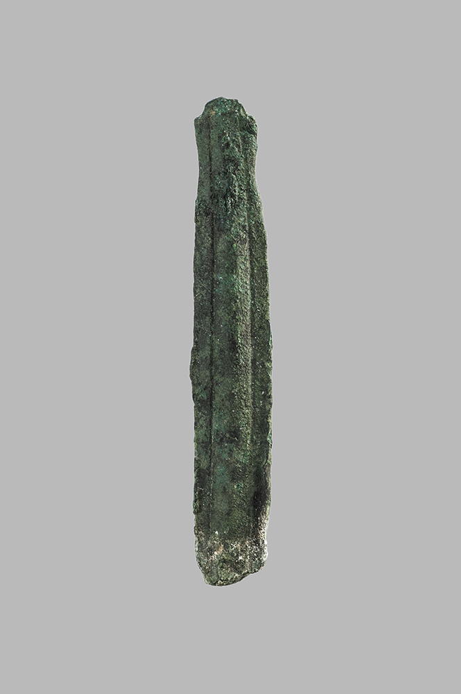 spada a lingua da presa attribuibile al tipo Monte Sa Idda. Il frammento corrisponde alla parte in cui la lama si unisce all'elsa. La guardia è composta da due spalle con margini arrotondati nella parte inferiore e rettilinei in quella superiore da cui parte la lama costolata evidenziata da una coppia di linee incise. La costolatura ha origine nella parte mediana della lingua da presa dove è affiancata da due allineamenti speculari di fori.