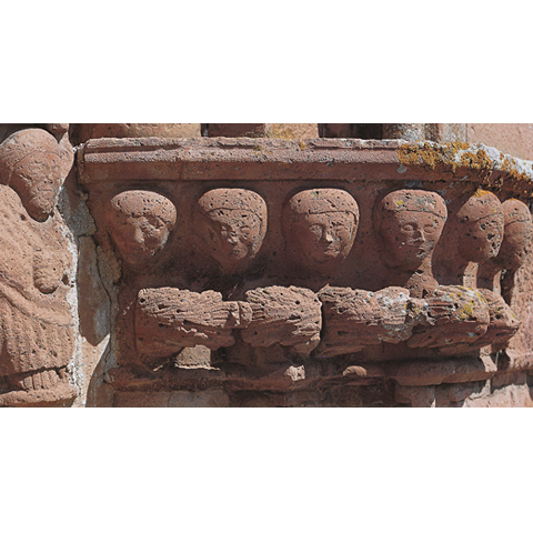 Die Fassade hat einen geformten Schuhsockel, der sich über den gesamten Umfang erstreckt und deutlich auf halber Höhe begonnen hat. Der untere Teil ist in drei runde, gewölbte Spiegel unterteilt, die zu einem Doppeltorus und Augenbrauen geformt sind. Das Portal öffnet sich im zentralen Spiegel. Die Lünette und die Pfosten sind innen von einem Torciglione-Fries bedeckt, während Stürze und Pfosten mit anthropomorphen und zoomorphen Figuren geschmückt sind. Das Ganze ist wieder in einem tiefen Thrombus vereint.