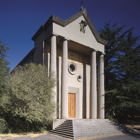 The church, consecrated in 1938, has a curious, very tall Doric pronaos surmounted by a broken tympanum and oculi for lighting.