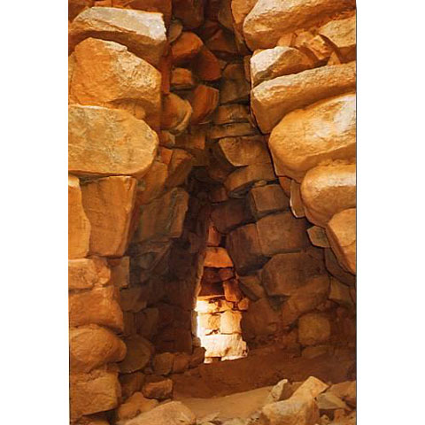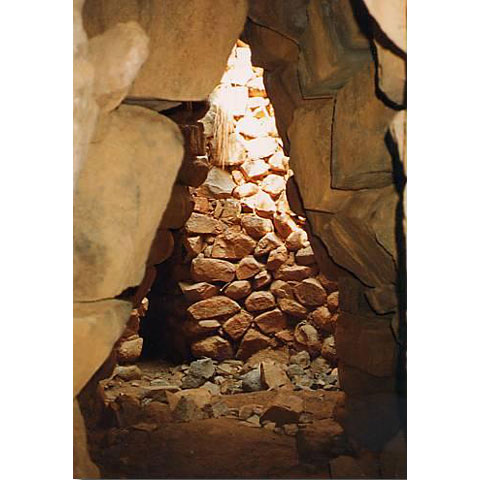 At the end of the corridor, an entrance with an angular roof (width m 1.70; height m 3.00) leads into the inner, eccentric, circular chamber (diameter m 4.60; height m 8.50), with a lowered floor plan.