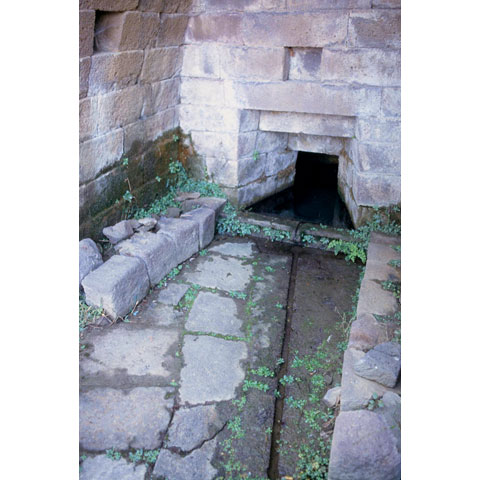 Durante los períodos de inundación, el agua que se desborda del pozo se drena, a través de un canal formado por los bloques del umbral y en las losas del piso del vestíbulo, hacia una segunda fuente pequeña construida dentro de una estructura de pared en la parte delantera.