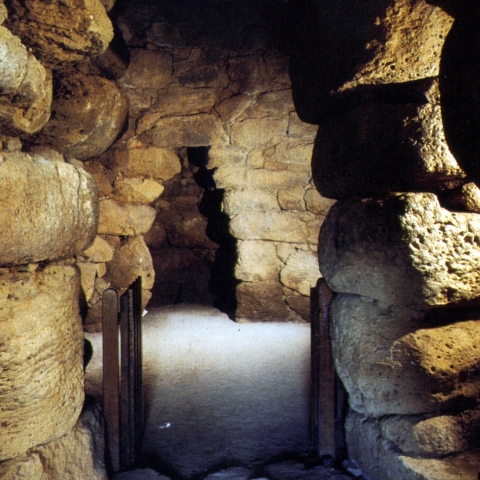 Le donjon (diam. est m 12 ; h res. 11,40) a l'entrée du SE ; il mène à un couloir qui mène aux « tholos », intacts, circulaires (diam. m 5,20 ; h m 7,60) et équipés de 3 niches semi-elliptiques (prof. m 1,80, largeur m 1,60 et h m 2,60). Le couloir comporte une niche au d. et au s. l'accès à l'escalier en colimaçon (largeur m 1 ; h m 3) menant au compartiment supérieur (diam. m 2,88 ; h m 3,46). L'escalier était peut-être à l'origine éclairé par des failles puis obstrué par le bastion.