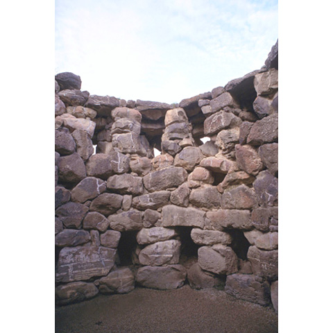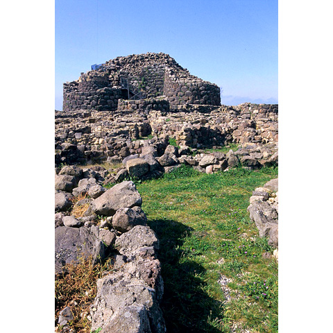 L'agglomération de 200 cabanes, désormais visibles à l'est et au sud de la forteresse, à l'extérieur et à l'intérieur de l'antiwall, s'est développée à partir de l'âge du bronze final (fin du XIIe siècle avant notre ère - début du IXe siècle avant notre ère). De cette époque, la cabane 135, qui révélait un rituel fondateur ; la cabane 80 (ou « du conseil »), dotée d'un siège circulaire et de niches dans les murs, qui renvoyait un modèle de nuraghe et était probablement destinée à des rencontres avec des valeurs politiques et religieuses.