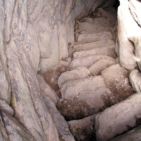 L'entrée quadrangulaire (largeur 1,18 m ; hauteur 1,58 m), fermée par une architrave (longueur 2,35 m ; largeur 1,05 m ; épaisseur 0,65 m) surmontée d'une fenêtre de drainage, mène à l'entrée (longueur 3,65 m ; largeur m 1,18/2,15/1,70 ; hauteur m 2,75) qui possède les deux entrées opposées des tours latérales.