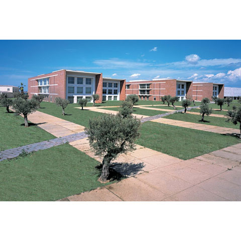 Le centre nodal du campus est représenté par le bâtiment d'entrée qui abrite le foyer et un auditorium pouvant accueillir 200 personnes, accompagnés de deux corps symétriques destinés aux bureaux et aux salles de réunion. Dans la partie la plus éloignée du campus, en revanche, se trouvent les bâtiments réservés à des fins fonctionnelles et opérationnelles.