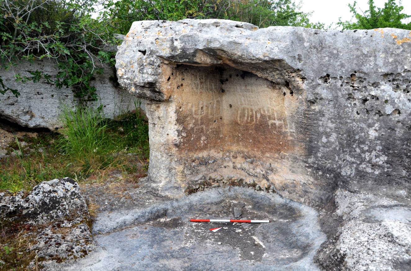 La particularité de l'hypogée est donnée par la présence de pétroglyphes, de figures schématiques gravées sur les parois du « dromos » et sur les côtés de la trappe près de l'entrée.