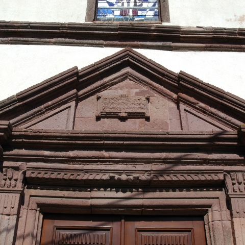 Le clocher, à barillet carré, est divisé en quatre ordres séparés par un cadre en marcapien, avec des fenêtres cintrées à lumière unique dans le dernier, et se termine par un parapet crénelé à quatre pinacles d'angle, orné de masques de tauromachie et de protomes à la base et de sphères au sommet, et par une flèche pyramidale ornée de chats. La façade, divisée en trois miroirs par quatre pilastres (en belles pierres de taille en vulcanite rouge) sur une base moulée, est divisée en deux ordres par un cadre moulé continu. Au centre de l'ordre inférieur se trouve le grand portail, encadré de pilastres rainurés et rouillés et d'un entablement orné de sculptures ; les pilastres sont flanqués de colonnes rudentées avec un chapiteau composite et un col à cordon, sur un haut socle orné d'une fleur, sur lequel est fixé le tympan triangulaire avec une plaque désormais illisible ; dans les rétroviseurs latéraux se trouvent deux simples fenêtres rectangulaires. L'ordre supérieur, avec une fenêtre centrée dans le prolongement du portail, se termine par une nuisance curviligne. Au-dessus des pilastres s'élèvent quatre acrotères en forme de chandelier, surmontés d'une tour centrale et d'une sphère sur les côtés.
