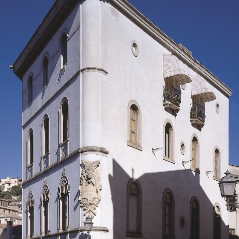 Le Palazzo Vigliaroni est situé le long de la rue principale de la ville, dans une zone irrégulière et en pente.