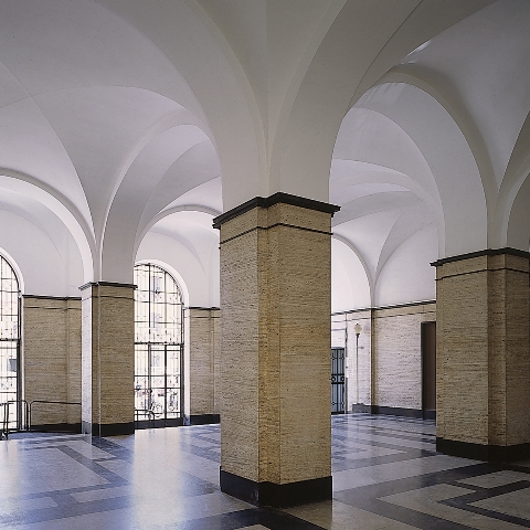 Même la grande et lumineuse cour recommence à simplifier l'extérieur, tandis que l'atrium est recouvert d'un sobre revêtement en travertin dans les piliers et les murs cruciformes, qui contiennent les anciennes armoiries de l'université, conformément à l'arrangement créé en 1940 par Filippo Figari avec l'aide des étudiants de l'Institut d'art.