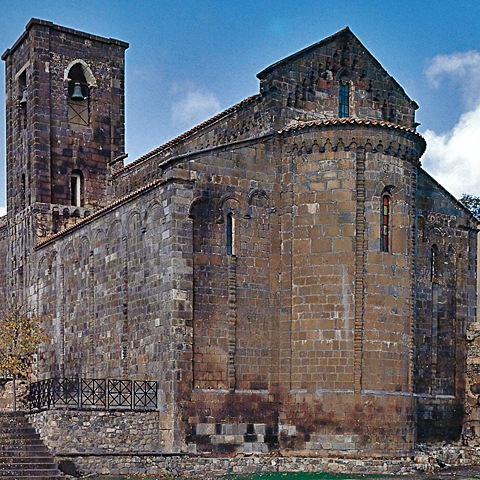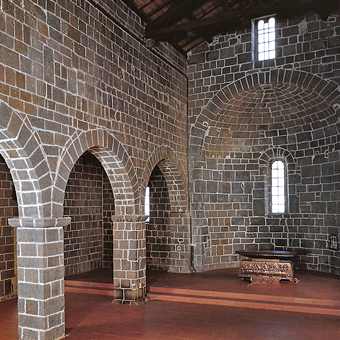 Un'iscrizione nella parasta all'angolo s. del prospetto E data al 1242 l'inizio dell'ampliamento, ultimato alla consacrazione nel 1268. L'abside fu demolita e al suo posto si costruì un'aula a tre navate coperte in legno, conclusa da nuova abside, più vicina al santuario altomedievale. Per via delle due fasi edilizie, la chiesa ha oggi pianta longitudinale di circa 50 m. Alla prima fase appartengono la facciata e l'aula per una lunghezza di poco meno di 20 m; alla seconda la parte restante, fino all'abside. La sobria facciata è caratterizzata da alte arcate a tutto sesto, che producono un forte slancio verticale alleggerendo l'imponente massa di scuro basalto. Maggiori concessioni all'elemento decorativo si notano nel prospetto absidale, dove lesene a soffietto partiscono le superfici. I terminali sono decorati con archetti lobati su peducci allungati.