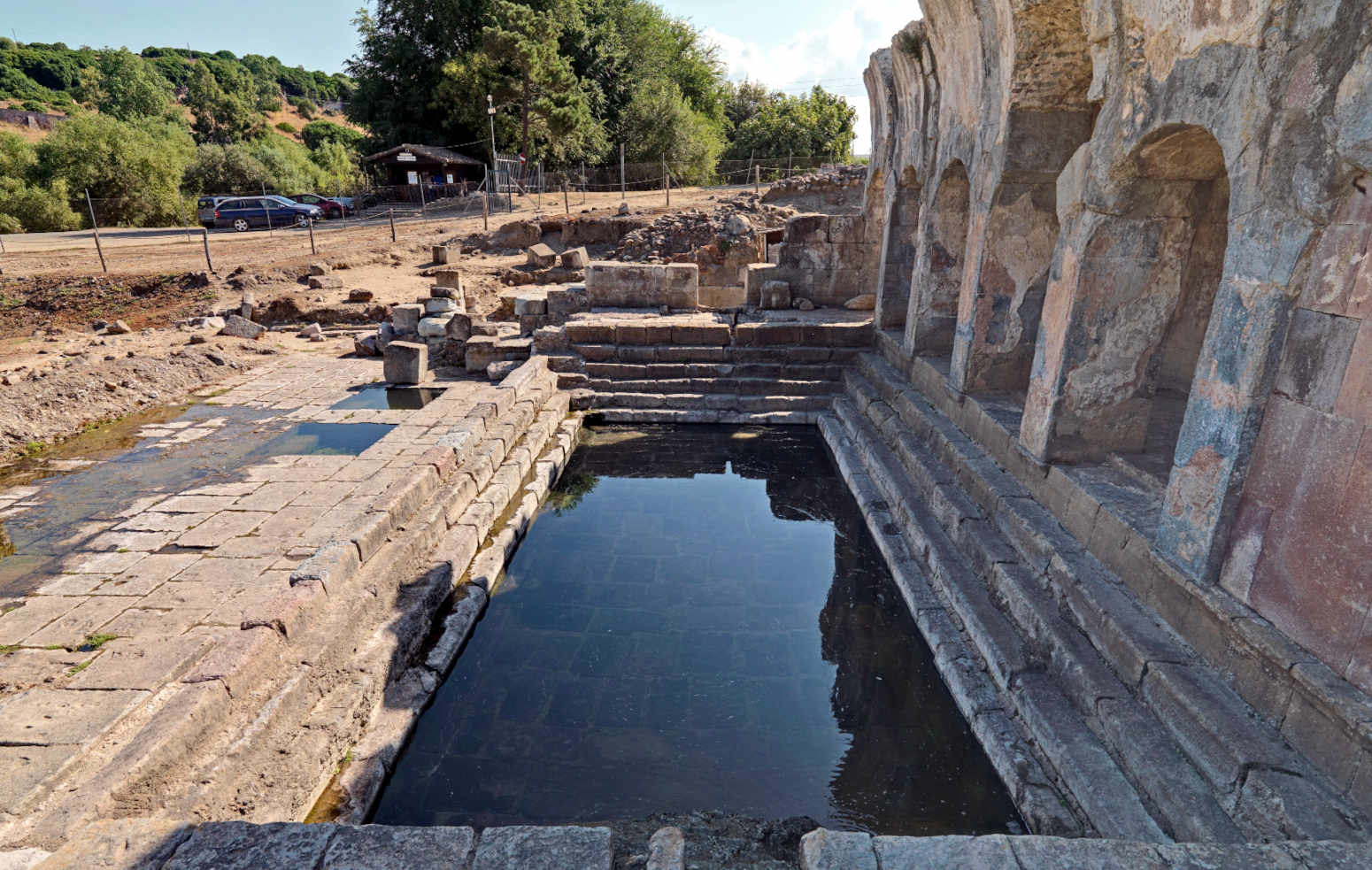 La struttura originaria dello stabilimento doveva essere in "opus quadratum", ossia in grossi blocchi di pietra squadrati; in seguito subì vari rimaneggiamenti. Al centro dello stabilimento si trova la "natatio", un'ampia piscina rettangolare (m 13 x 6,5; profondità m 1,5) per balneazioni tiepide (l'acqua calda termale veniva stemperata adducendo acqua fredda da serbatoi situati a monte). La piscina era coperta con volta a botte. I lati S e N erano originariamente porticati; residua il portico S con pilastri a sezione quadrata in blocchi di vulcanite e volta a botte in opera cementizia rinforzata da anelli di blocchi vulcanici cuneati. Lucernai quadrati ne assicuravano l'illuminazione. Sul lato N della "natatio" furono realizzate tre vasche quadrangolari, mentre sul lato E è presente un edificio rettangolare con nicchie sui lati lunghi; una di queste ha restituito un altare consacrato alle ninfe da Servato, liberto dell'imperatore e procuratore delle miniere e dei latifondi imperiali, per la guarigione di Quinto Bebio Modesto, governatore della Sardegna vicino agli imperatori Caracalla e Geta (211-212 d.C.).