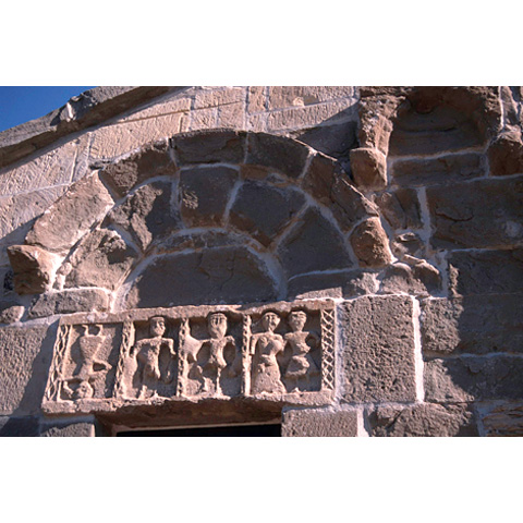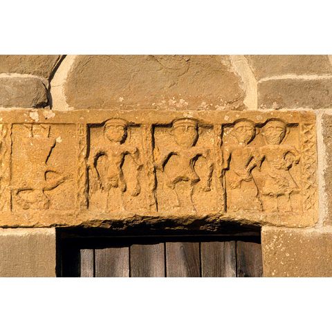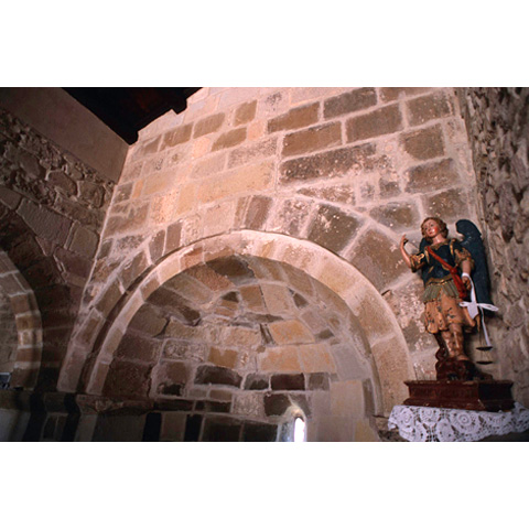 La chiesa subì lavori di restauro nel 1960; l'originaria muratura in arenaria bruna si conserva nella facciata, nel setto divisorio e nell'abside. Nella piccola facciata (7,27 m) è interessante il fregio scolpito sull'architrave del portale s., che mostra, entro quattro riquadri, cinque figure antropomorfe dalle larghe spalle e dagli arti esili, separate da bande verticali con motivo a rombi, stilizzazione del motivo classicista a nastro intrecciato. La prima figura, capovolta, forse indica Lucifero, l'angelo caduto; le ultime due, che non sono separate tra loro dalla banda, ma anzi sono allacciate, potrebbero essere Adamo ed Eva. Le restanti potrebbero rappresentare una l'arcangelo Michele, a cui la chiesa è dedicata, e l'altra, di maggiori dimensioni, Dio padre.