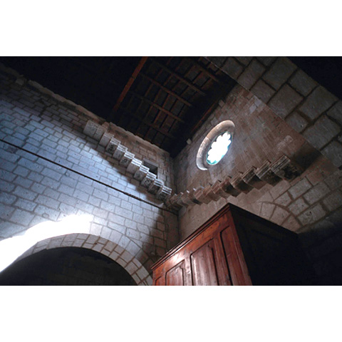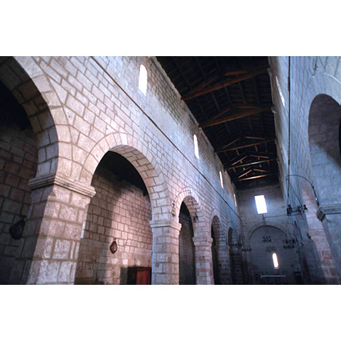 La chiesa (m 30 x 13, alta 12 m circa), in pietra sedimentaria e vulcanica locale, ha pianta a tre navate divise da arcate a tutto sesto impostate su pilastri quadrangolari sagomati agli spigoli. L'abside è a N/O. La copertura è lignea.