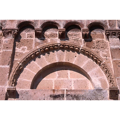 In entrambi gli ordini si dispongono archetti su peducci con soggetti vegetali, presenti anche nei prospetti laterali e in quello absidale. Questi a loro volta ripropongono, mediante l'uso delle lesene, la stessa suddivisione in specchi. Un frontone liscio e forato da una luce a croce conclude il prospetto absidale.