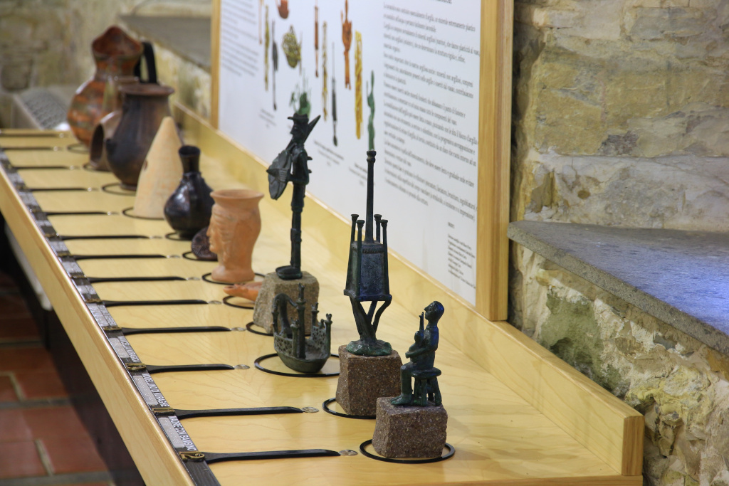 I materiali votivi giacevano invece a partire dal pavimento della camera e del corridoio del mastio: per la maggior parte lucerne (circa 600), ma anche monete, vasi vitrei e pochi elementi in metallo prezioso e fittili.