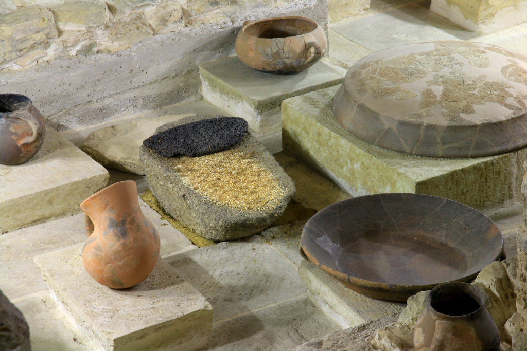 Evolute e di alta qualità, talvolta decorate a stecca con eleganti motivi geometrici, le ceramiche rinvenute nel villaggio: vasi piriformi, fiasche, brocchette, "antipastiere", sassole, portabrace, pintadere. Ma anche ziri, caldaie, coppe di cottura, bacili e macine che testimoniano l'operosità di questa antica comunità agricola. La capanna 12 ha inoltre restituito grani di cereali, ghiande, leguminose e un frammento di pane carbonizzato. Tra i resti di pasto: ossa di bue, pecora-capra, maiale-cinghiale, cervo, prolago e valve di lamellibranchi.