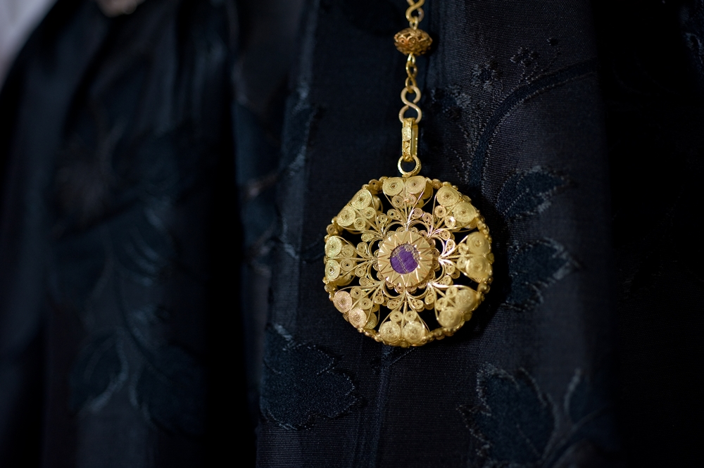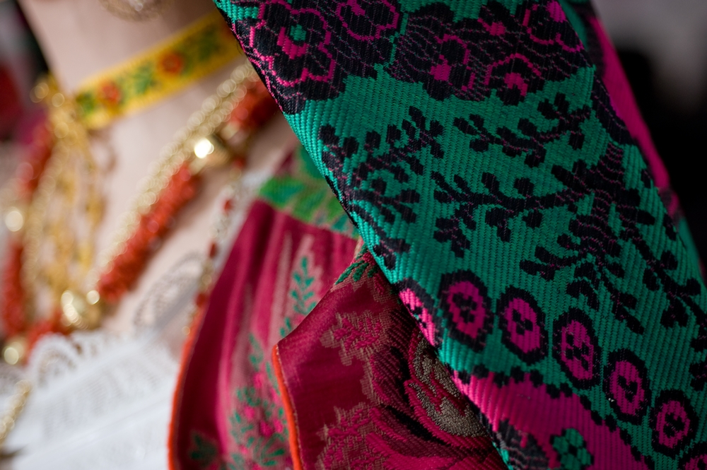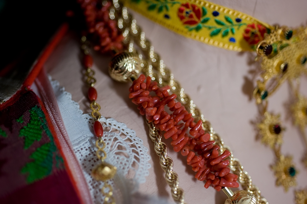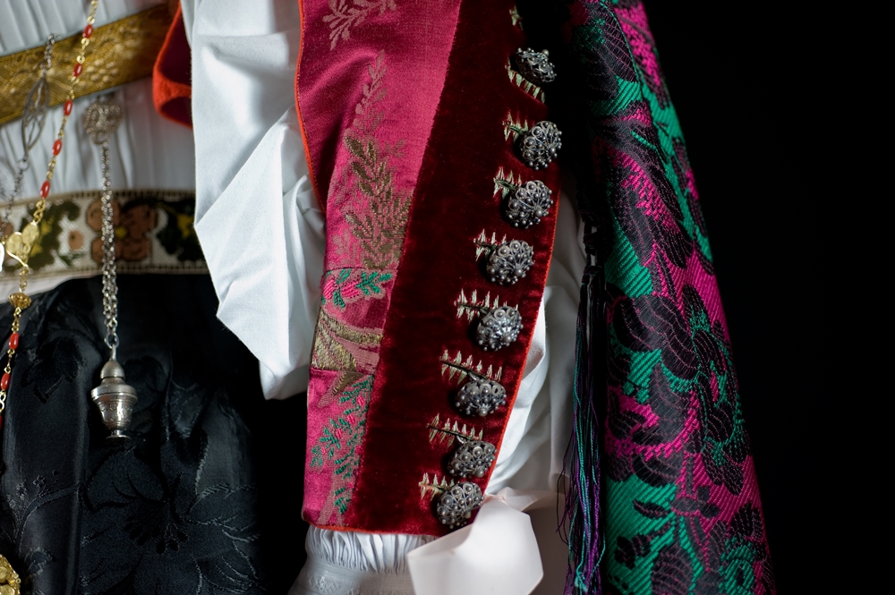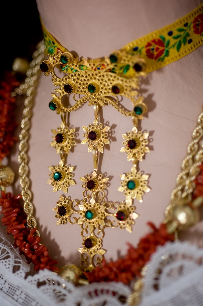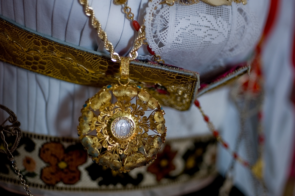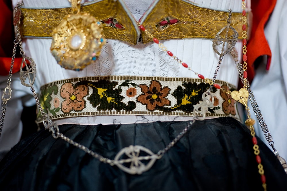 It is characterized by the abundant set of traditional jewels. The skill of Dorgali goldsmiths, in fact, is renowned all over the island. The most characteristic jewel is sa zòica, a rich gold pendant that is worn around the neck with its ribbon. Sa Zòica is made of gold foil decorated with filigree and fretwork, studded with green and red crystals. As for the shape, it consists of a cross surmounted by a bow. Unmissable are sa guturada, a necklace with several coral threads interspersed with large golden holes, and the two buttons placed at the closure of the shirt collar, made of gold filigree with a central bezel containing turquoise paste. Pinned to the chest is spilla 'e petorra, a brooch in foil and gold filigree with a floral shape. The coral and gold rosary with a round medal in gold and mother-of-pearl filigree hangs around the neck. A gold chain is added to the rosary, from which hangs a filigree reliquary containing a fragment of brocade. The whole thing is a silver chain, secured to the bodice, to which are hung s'isprugadentes, the toothpaste, which combines the practical function of a toilet accessory with that of an amulet, and sa nuschera, a silver perfume holder in the shape of an ampoule, also equipped with an amuletic