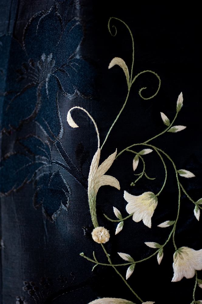 The apron is made of black satin embroidered with floral patterns and surrounded by lace.