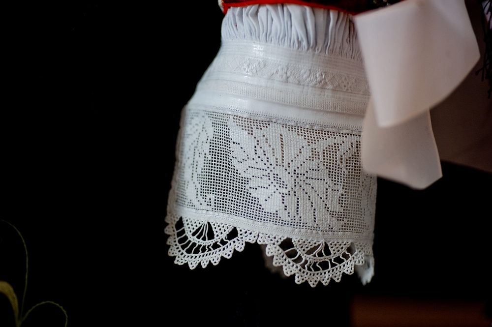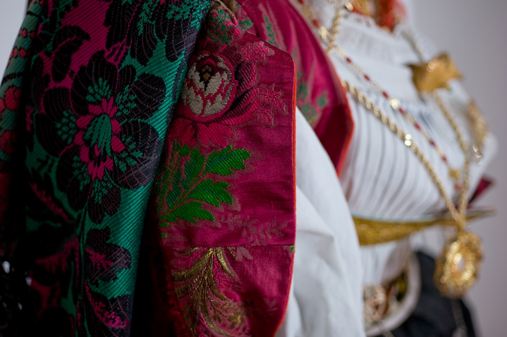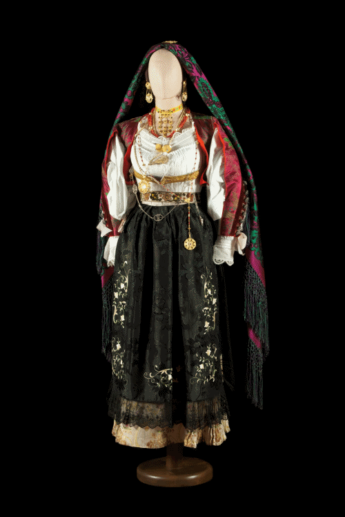 The example of women's gala dress from Dorgali (Nuoro) portrayed in the photographs dates back to the first half of the 20th century and is kept at the Nuoro Costume Museum.
