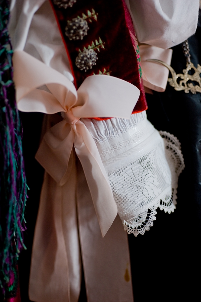 The white cotton canvas shirt features pleats and rich embroidery (on pervenimentu and on chorus). The cuffs are adorned with pink bows, typical of