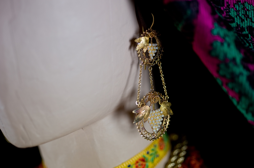 value.The flashy pendant earrings are in foil and gold filigree with pearls clumped together to suggest the shape of bunches of grapes, a symbol of good wishes of abundance.