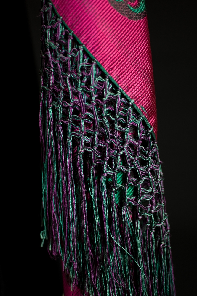 .The hair is collected using sos cucos, two croquettes placed at the top of the head and held together by a triangular piece (sa perrichedha), all covered by a long shawl (s'isallu), with floral motifs and terminal fringes, secured at the top of the head by a gold brooch.