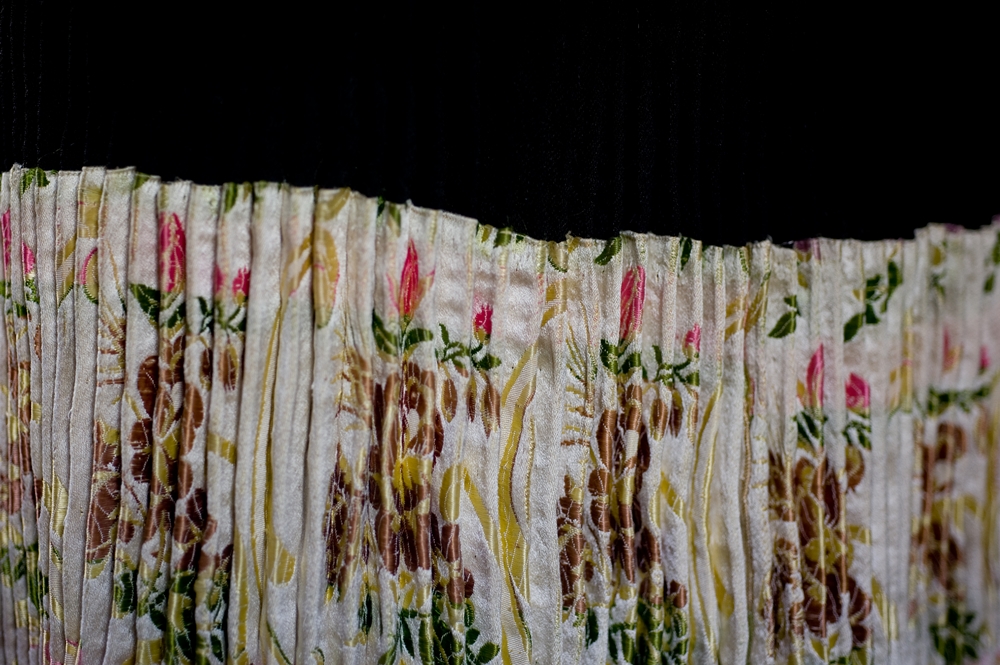 The skirt (like tunic) in black orbace, smooth on the front and pleated at the hips and in the back, ends with a large ruffle in light brocade.