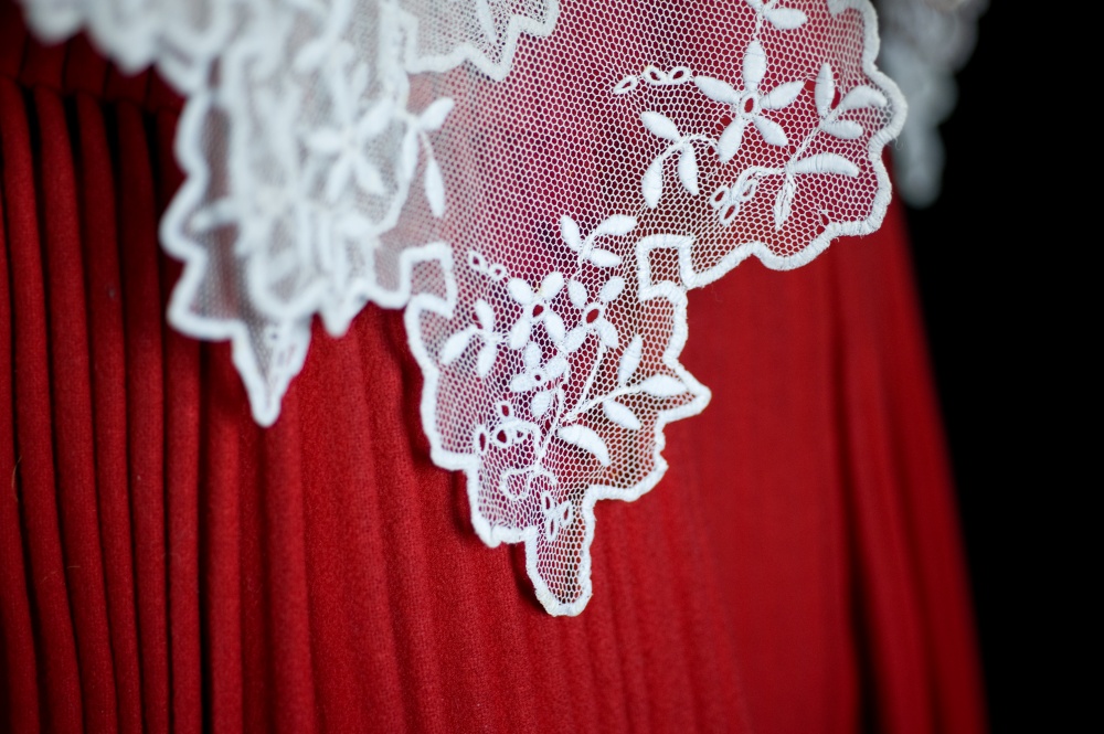 El delantal, casi tan largo como la falda, es de seda negra con ribetes.