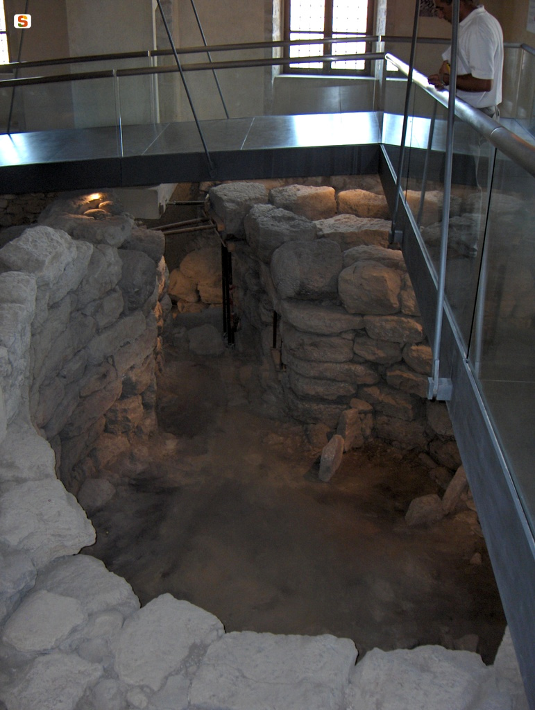 El palacio se construyó sobre las ruinas de un nuraga de tres lóbulos, llamado popularmente «Nurax'e Cresia», ya que está cerca de la iglesia parroquial de la Santísima Virgen Inmaculada. Con la renovación de los interiores del edificio para su uso museístico, se pudieron destacar estas ruinas, secciones del antemuro y una parte del pueblo, que ofrecen una vista fascinante del monumento nurágico desde arriba, gracias a un sistema de pasarelas y pisos transparentes. Una serie de paneles educativos dispuestos a lo largo de las pasarelas permiten adentrarse progresivamente en un camino de conocimiento general sobre la civilización nurágica, más puntual en los entornos superiores, dedicado a los eventos y excavaciones del famoso nuraga «Su Nuraxi», ubicado a poca distancia del palacio feudal. Se presentan algunos contextos particularmente significativos, como la «cabaña de los 80», de la que proviene un betilo de piedra con forma de nuraga de una sola torre. El itinerario se cierra con una sala inferior que muestra algunos tipos de hallazgos con el objetivo de explicar sus funciones en relación con las prácticas de vida en la era nurágica.