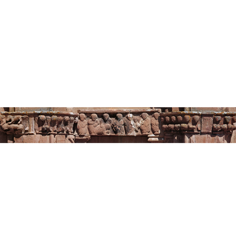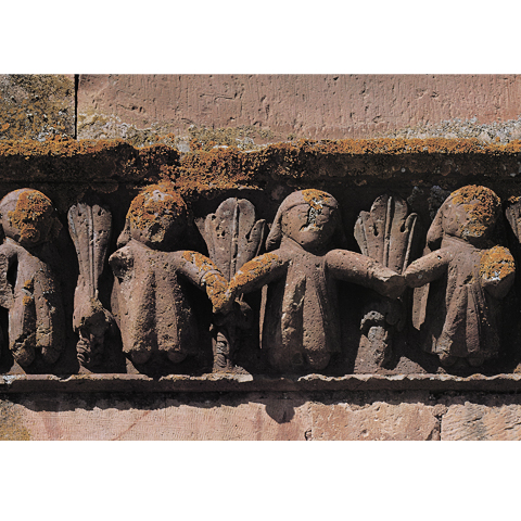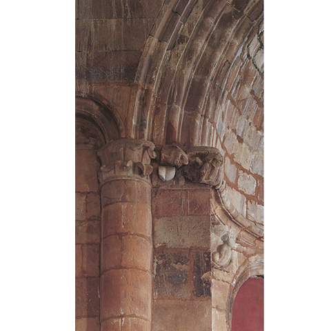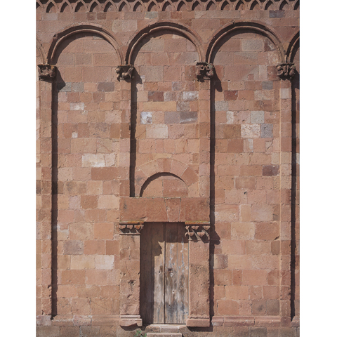 Sa fatzada tenet unu zoccolo a sabata sagomata, chi curret longu totu su perìmetru, e est in manera neta mòvida a metade artària. S'ala inferiora benit partzida in tres ispigros dae arcadas a totu de ses modanate a dòpiu toru e sopraccigliate. In s'ispigru tzentrale s'aberit su portale. Lunetta e stipiti sunt ribattuti in manera interna de unu fregio a torciglione, mentras architraves e stipiti sunt ornati cun figuras antropomorfas e zoomorfas. S'ammenta rincassa in unu profundu strombo.