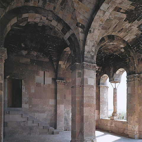 Su pòrticu duecentesco tenet ses campadas bortadas a crusiera subra de pilastros cruciformi. Su pranu superiore de su pòrticu tenet tres ambientes bortados a carrada, unu de sos cales s'incrarat subra de sa navada tzentrale. A s'internu de custos ambientes, prepostos a capella obispale e comunicantes cun s'episcopio, s'agatat una tziminera a forma de mitria. A s'esternu s'aberint in su primu òrdine tres arcadas; in su segundu si disponet una sèrie de archetos a ogiva. In sa larga parasta laterale sunt ladinas sos contzas de ammorsatura a sos muros de àmbitu de s'episcopio, chi s'isvilupaiat longu su costàgiu deretu de sa crèsia.