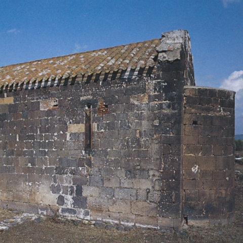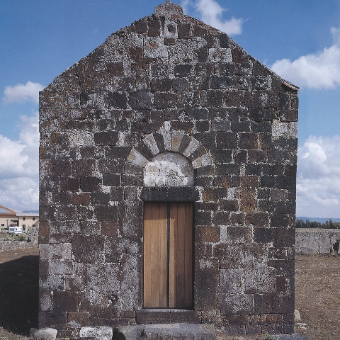A su colmo de sa fatzada s'agatat una cantone traballada pro acollire unu batzinu tzeràmicu polìcromu, chi deviat ispicare non pagu subra de sa trama iscura de su muru de preda niedda. Longu su costàgiu S, belle a impinna a sa fatzada, s'aberit su segundu portale, fintzas issu de su tipu architravato e lunettato a totu ses torradu a pesare de unu contzo. S'àbside est realizada in contzas de vulcanite iscura in manera mèdia prus mannas de sos impreados in fatzada.